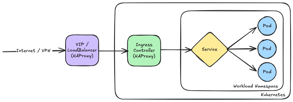 - Le trafic HTTP/HTTPS passe par l'Ingress Controller (HAProxy)