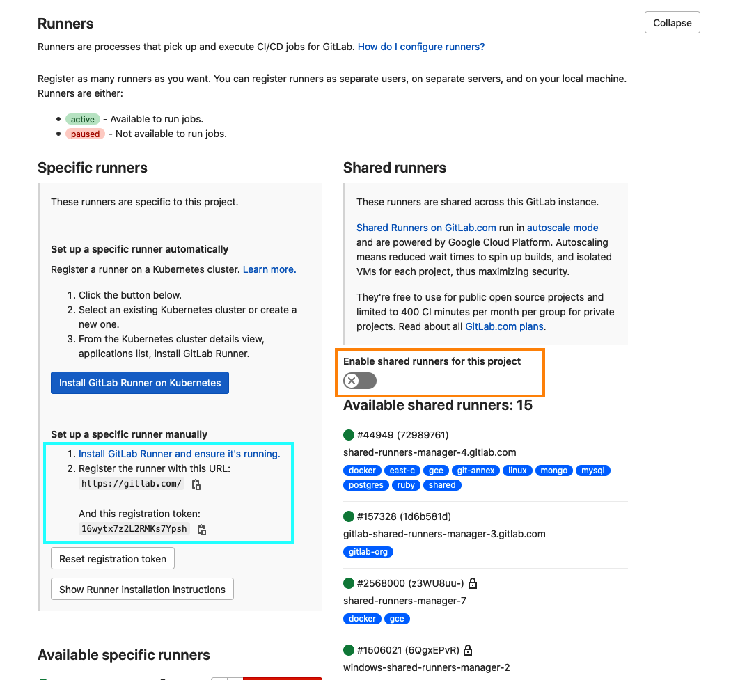 - Désactiver les runners mutualisés (encadré orange) : permet d'utiliser exclusivement votre runner dédié
