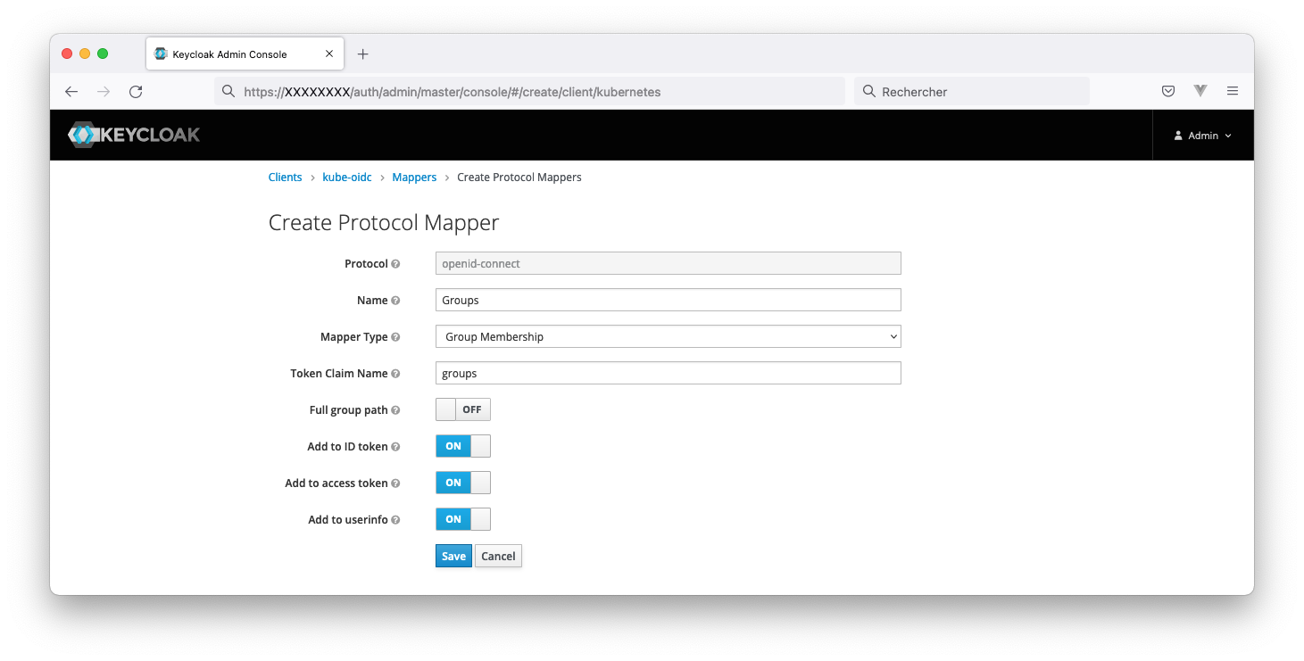 Par défaut, lorsque l'utilisateur validera son authentification au travers du client que vous venez de créer, les informations sur les groupes auxquels l'utilisateur appartient ne remontent pas dans le token JWT renvoyé à kubectl. Nous devons activer cela en faisant un mapping de groupes.