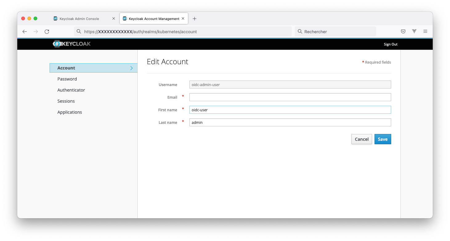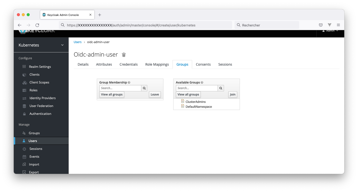 Lorsqu'un utilisateur se voit identifié dans Keycloak, Kubernetes va vérifier ses droits dans les RBAC du cluster. L'identifiant de l'utilisateur sera oidcuser:XXXX-XXXX-XXXX-XXXX pour un utilisateur et oidcgroup:YYYY-YYYY-YYYY-YYYY pour un groupe. Cela permet d'utiliser ces notations pour la création des ClusterRoleBindings et RoleBindings.