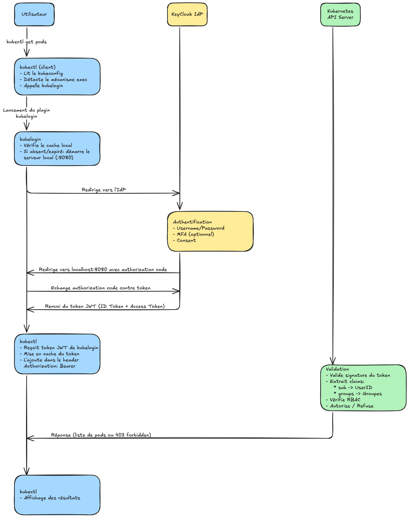 Voici le déroulement complet d'une authentification OIDC avec Kubernetes :