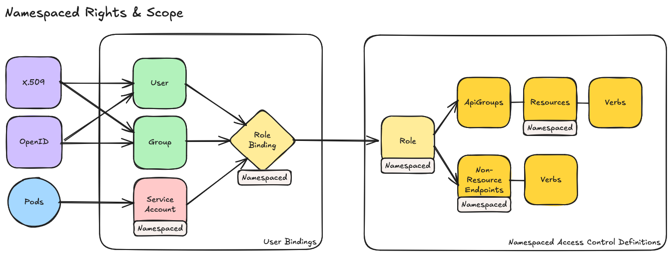 Les RoleBinding associent un Role ou un ClusterRole à un ou plusieurs sujets (subjects) dans un namespace spécifique. Cette approche permet de séparer logiquement un cluster avec des utilisateurs uniquement capables d'accéder aux ressources de leur Namespace attribué.